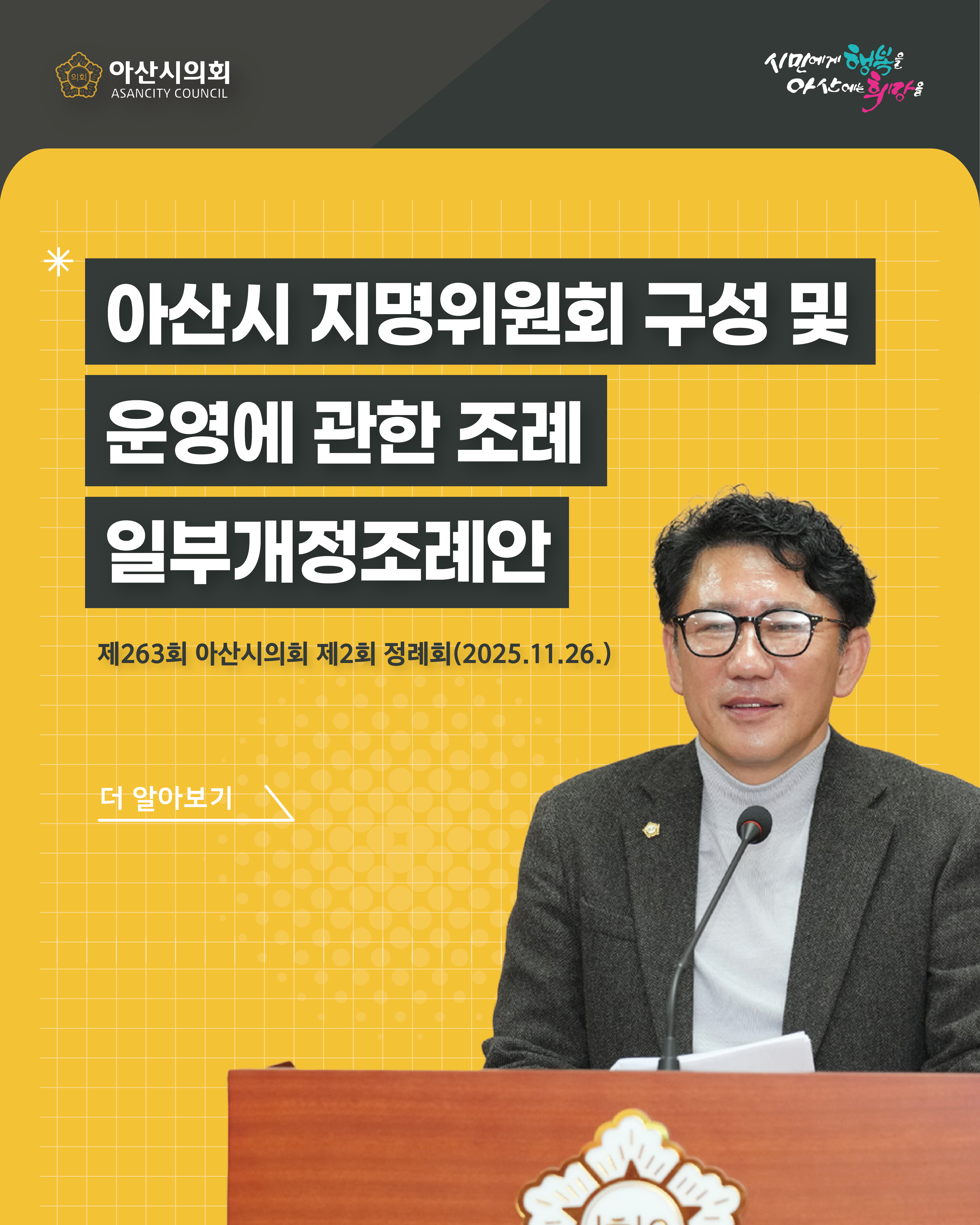 아산시의회 윤원준 의원, “아산시 지명위원회 구성 및 운영에 관한 조례 일부개정조례안”발의