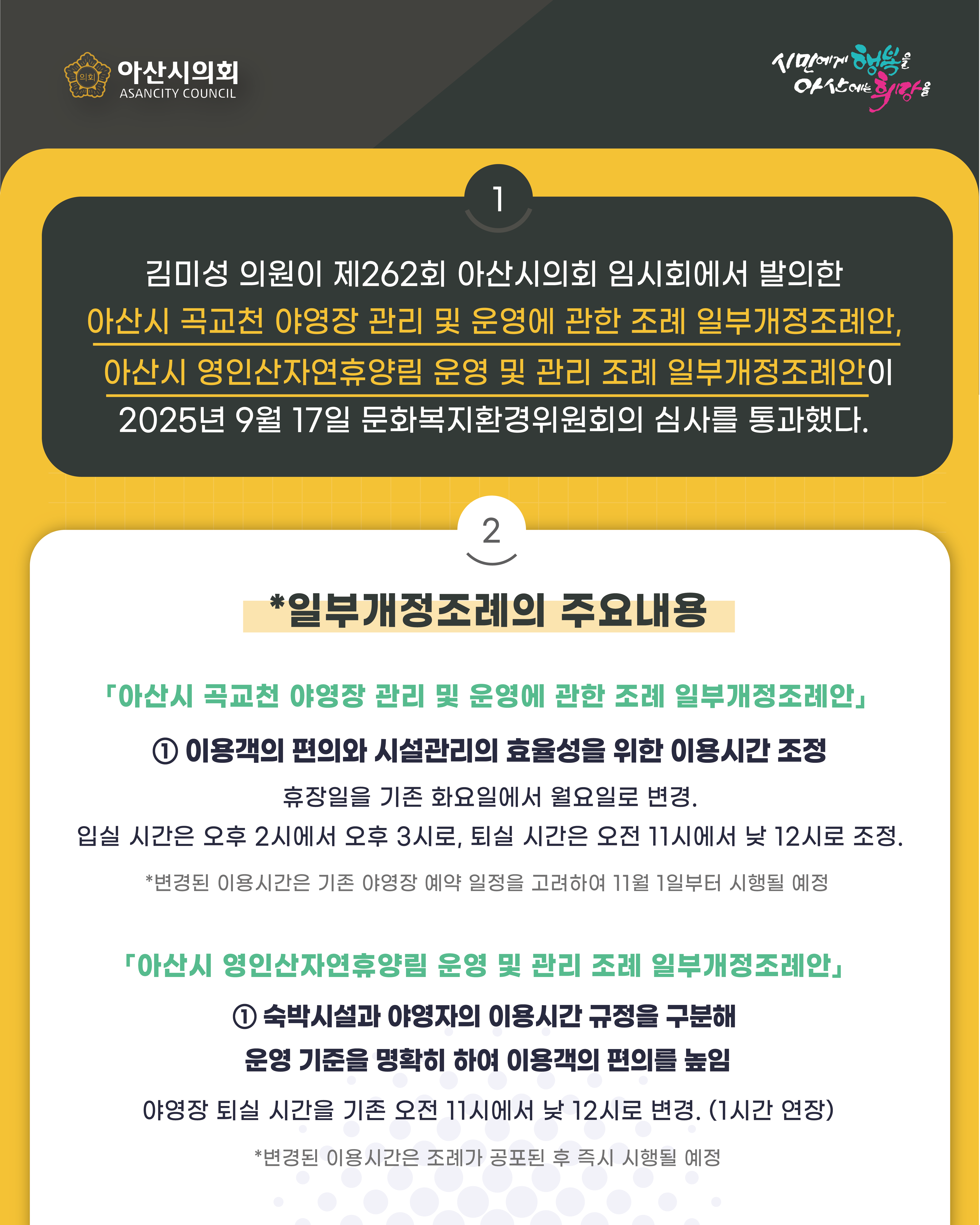 아산시의회 김미성 의원, "시 운영 야영장 퇴실 시간 낮 12시로 연장"