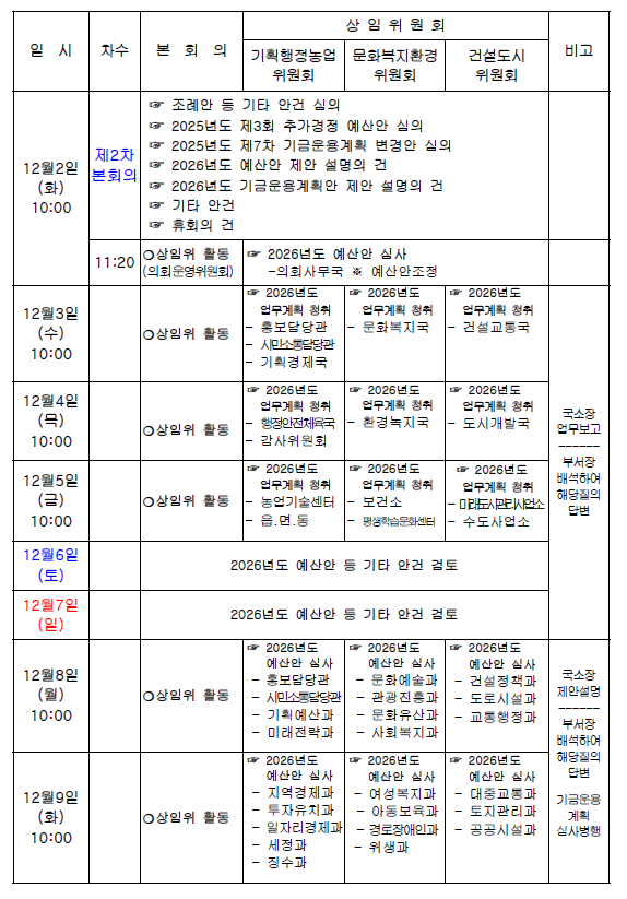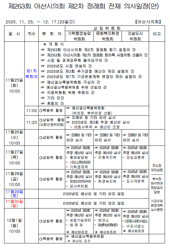 제263회 아산시의회 제2차 정례회 전체 의사일정(안)