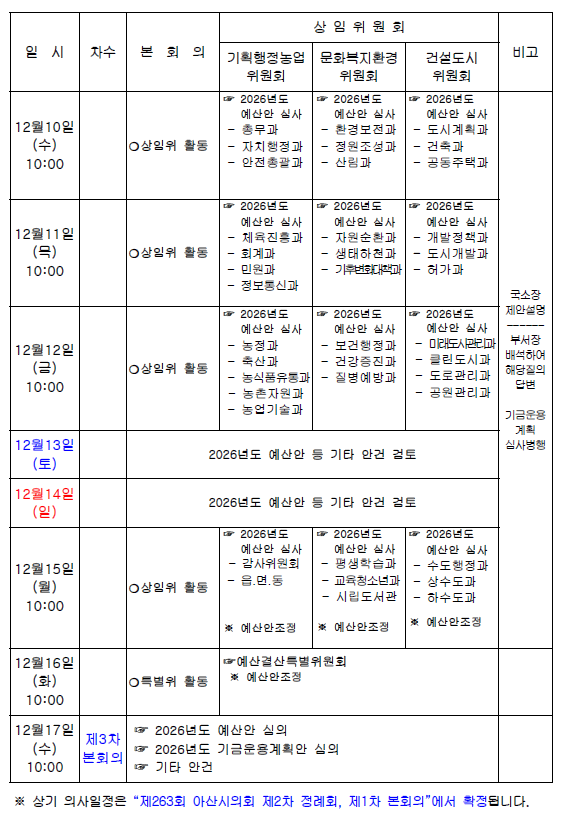 제263회 아산시의회 제2차 정례회 전체 의사일정(안)을 공지합니다.